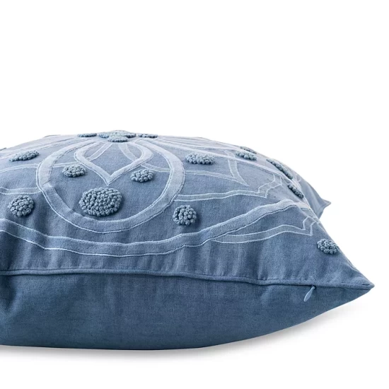 - Luxe linen cover is adorned with velvet appliqué and finished with hand-stitched French knot detailing