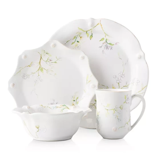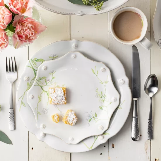 - Dimensions: 11″L Dinner Plate; 9″L Salad/Dessert Plate; 4.75″L Mug