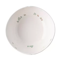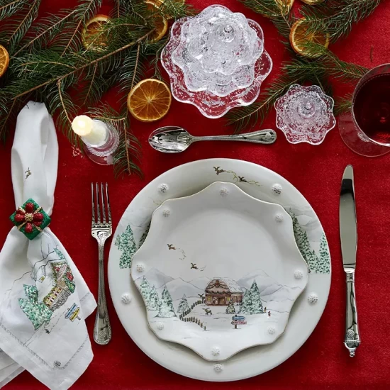 The mythical, folkloric world of the North Pole is hand illustrated atop Juliska’s iconic Berry & Thread shapes in this holiday dinnerware collection. Handcrafted to delight guests of all ages, pieces depict colorful images of a snow-covered elves’ village, Santa’s cottage and other scenes.