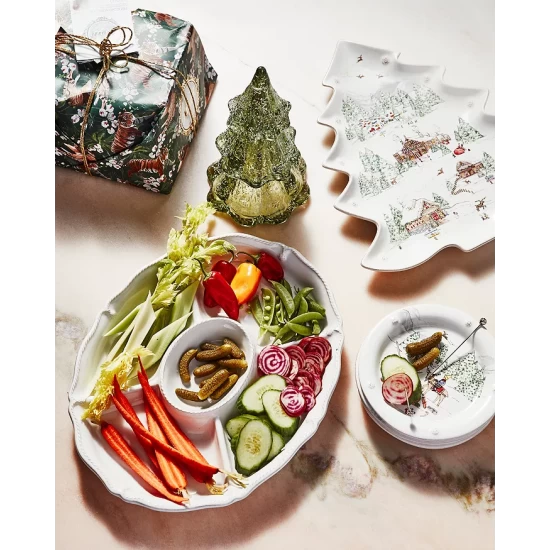 - Find the elves’ village and toy workshop depicted on this tree shaped platter. Fantastic as a gift or to use on your table to serve appetizers, sides, Christmas cookies or cheese and crackers!