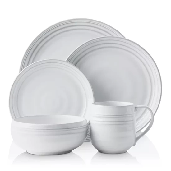 - Set includes: dinner plate, dessert plate, cocktail plate, cereal bowl, mug