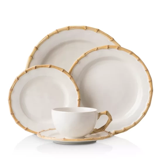 Pure white stoneware is edged with a classic bamboo lending this set from Juliska a naturalistic glamour. Designed for everyday use.