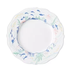 - Festooned with marvelous creatures in sunwashed pastels, this charming scalloped plate layers beautifully with many different patterns.