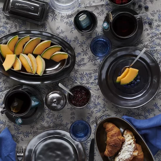 Juliska Pewter Stoneware has a rich, old-world luster that summons up visions of grand European estates. It beautifully showcases Juliska’s unique “mottling” technique, which gives each piece a unique hand-hammered design.