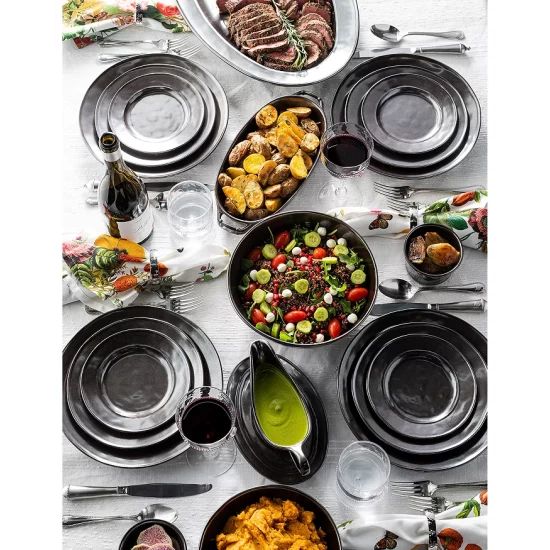 Juliska “Pewter” Stoneware has a rich, old-world luster that summons up visions of grand European estates. It beautifully showcases our unique “mottling” technique that gives each piece an original, hand-thumbed, hammered design. Layer it with all your Juliska stoneware, such as “Berry & Thread” or “Jardins Du Monde.”