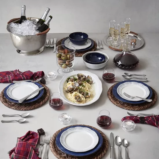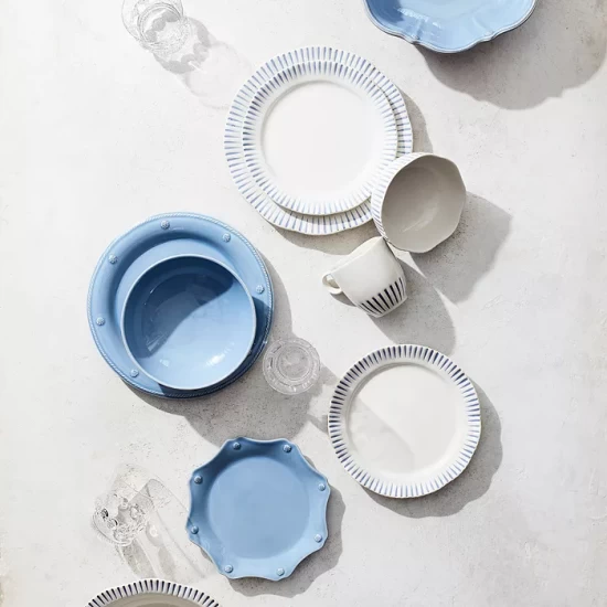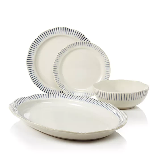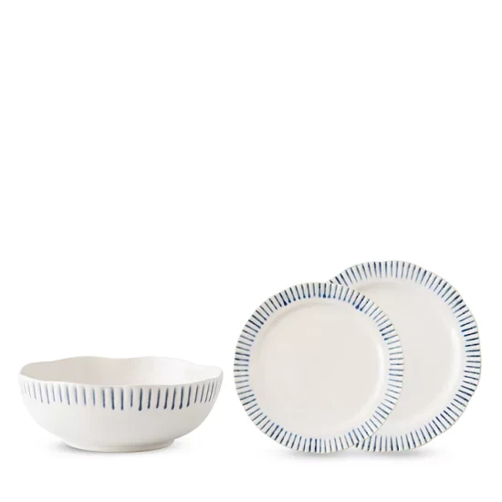 Subtle striping and an organic silhouette bring effortlessly elegant style to the table in this dinnerware collection from Juliska.