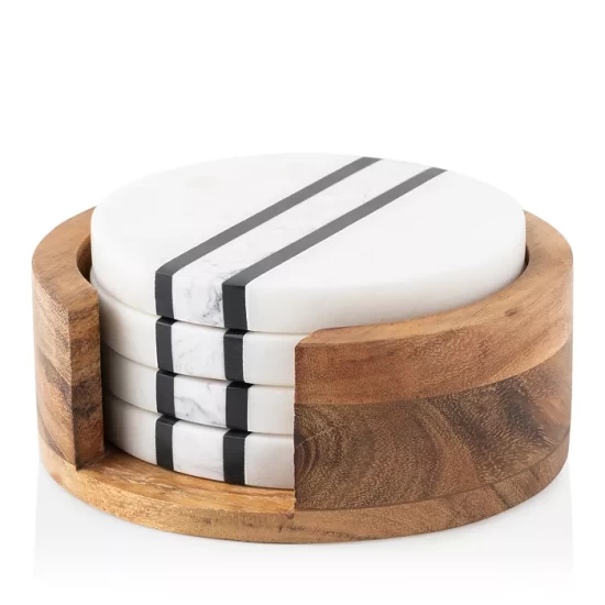 - Base: acacia wood; coasters: resin